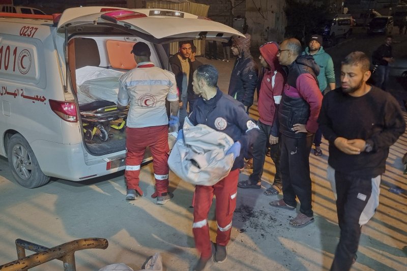 지난 3월 18일(현지시간) 가자지구 남부 칸유니스에서 구급대원들이 이스라엘의 공습으로 숨진 팔레스타인 희생자들을 병원으로 옮기고 있다.AP뉴시스 |