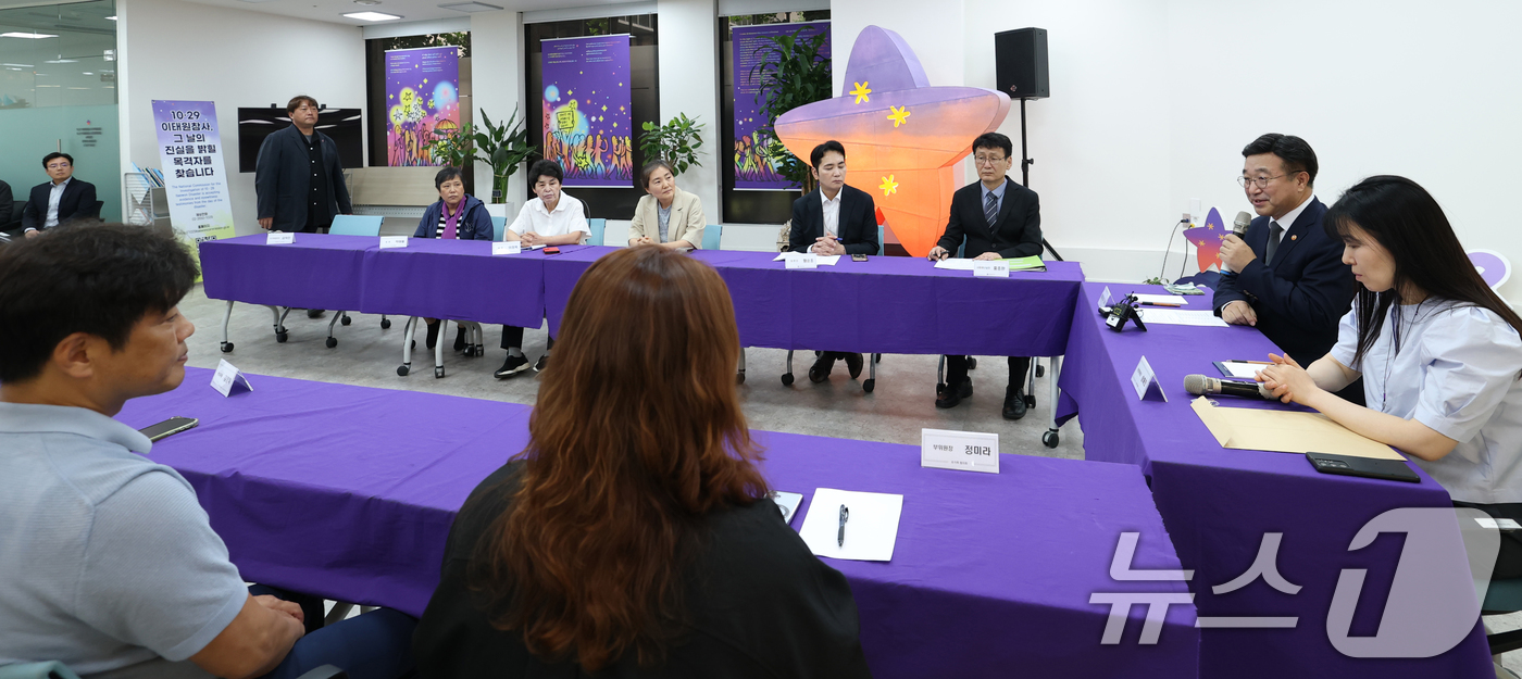 (서울=뉴스1) 권현진 기자 = 윤호중 행정안전부 장관이 4일 오후 서울 종로구 적선동 별들의 집을 방문해 10·29 이태원 참사 희생자 유가족들과 면담을 하고 있다. 2025.8.4/뉴스1