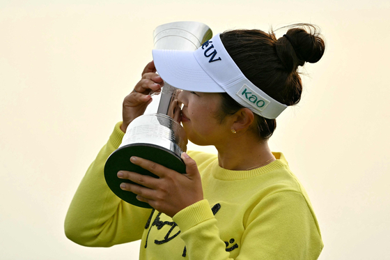 4일 AIG 여자오픈에서 우승한 야마시타 미유가 우승컵에 입을 맞추고 있다. AFP=연합뉴스 |