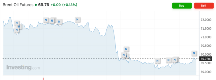 국제 유가는 전일 선반영에 더해 이날 발표 이후 소폭 추가 하락했다. 브렌트유 10월 인도분은 1% 하락해 배럴당 69.27달러로 내려왔다. 서부 텍사스산 원유 9월 인도분은 0.6% 떨어진 66.93달러에 거래됐다.