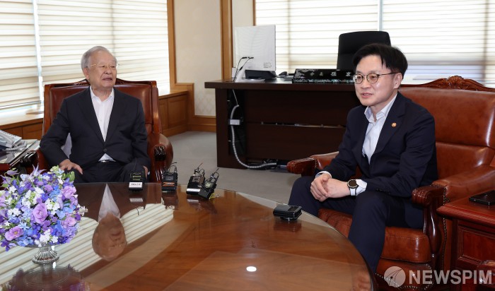 [서울=뉴스핌] 정일구 기자 = 김정관 산업통상자원부 장관이 4일 오후 서울 마포구 한국경영자총협회를 찾아 손경식 경총 회장과 면담을 하고 있다. 2025.08.04 mironj19@newspim.com |