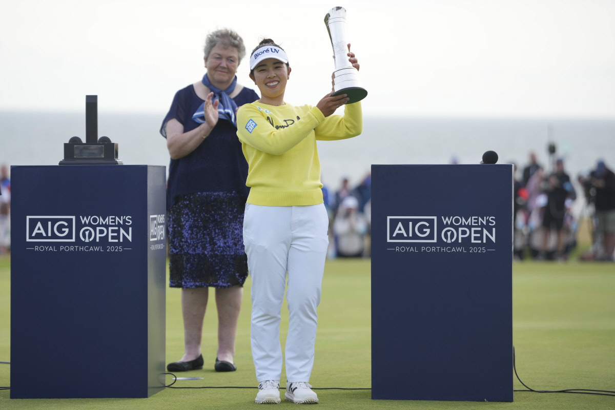특급 신인의 LPGA 첫 트로피 야마시타 미유(일본)가 4일 미국여자프로골프(LPGA) 투어 메이저대회 AIG 여자오픈에서 우승한 뒤 트로피를 들어 올리고 있다. 웨일스 | AP연합뉴스 |