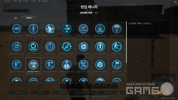 디바이스는 각종 상황의 '발생 조건'과 '결과'를 연결해주는 시스템이다. 예를 들어, 일정 지역에 진입하면 특정 장비가 지급되도록 하거나, 특정 위치에 도달한 팀에게 점수를 부여하는 방식의 콘텐츠를 구현할 수 있다. 이번 알파 버전에서는 29종의 디바이스가 제공되며, 기본적인 점수판, 스폰 장치, 즉사 지역 생성 외에도, 트리거 기반 이벤트 실행, 레드존 발생 조건 지정, 슈퍼 점프와 이동 수단 등장 시점 제어 등도 구현 가능하다.