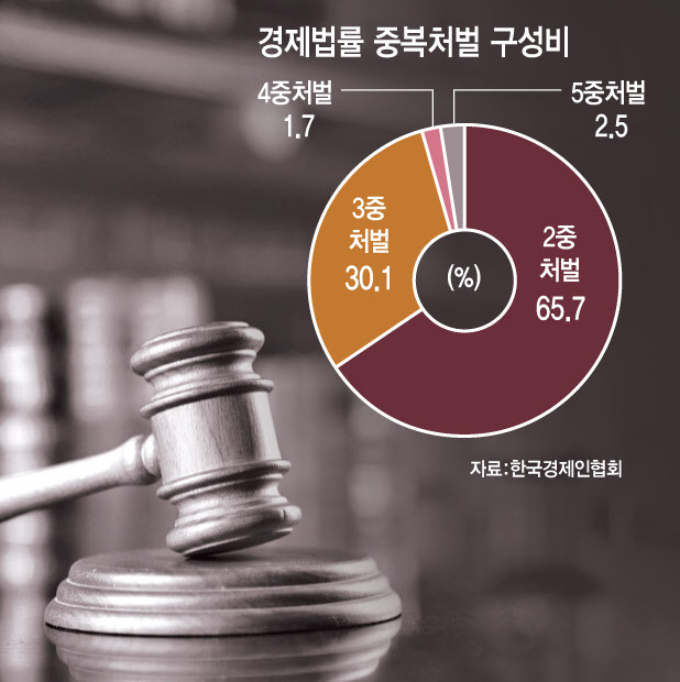 특히 6568건 중 2376건(36.2%)은 법 위반에 대해 징역 또는 벌금을 포함한 두 개 이상의 처벌·제재 수단을 규정했다. 징역, 벌금, 몰수, 자격정지, 과징금 등을 한꺼번에 처벌할 수 있도록 한 것이다. 2중처벌이 1561개(23.8%)로 가장 많았다. 3중처벌(714개·10.9%), 4중처벌(41개·0.6%), 5중처벌(60개·0.9%) 등도 적지 않았다.