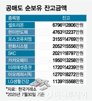 공매도 순보유 잔고금액이 가장 많은 코스피 종목은 셀트리온으로 6796억2806만원이었다. 뒤를 한미반도체(4763억2237만원), 포스코퓨처엠(3155억4769만원), 한화시스템(2052억5556만원), SKC(2021억8797만원), 카카오페이(1950억3258만원), 미래에셋증권(1720억4239만원), 아모레퍼시픽(1270억8272만원), LG생활건강(1139억5568만원)이 뒤를 이었다.