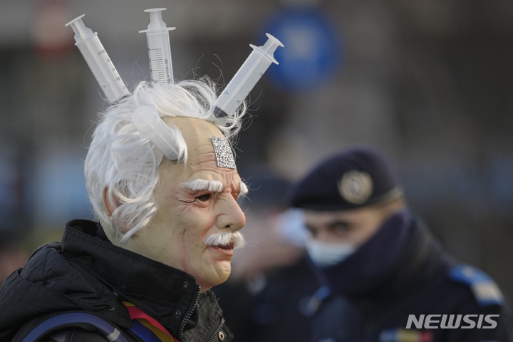 [부쿠레슈티=AP/뉴시스] 루마니아 부쿠레슈티에서 코로나19 방역을 위한 그린 패스 반대 시위가 열린 2021년 12월 21일에 한 시위 진압 경찰관이 주사기가 부착된 라텍스 마스크 가면에 QR 코드를 붙이고 시위대와 대치하고 있다. 코로나19 백신반대 시위가 격렬했던 루마니아에선 올해 7월에도 신규 환자가 1703명 사망자가 7명 발생했다. 2025.08.05. |