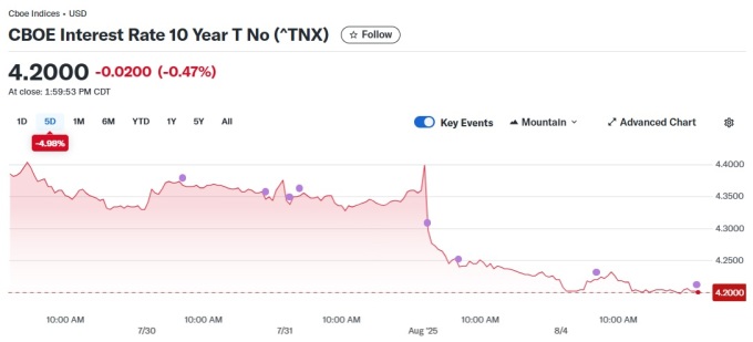 미 국채 10년물 차트, 자료=야후 파이낸스, 2025.08.05 koinwon@newspim.com |