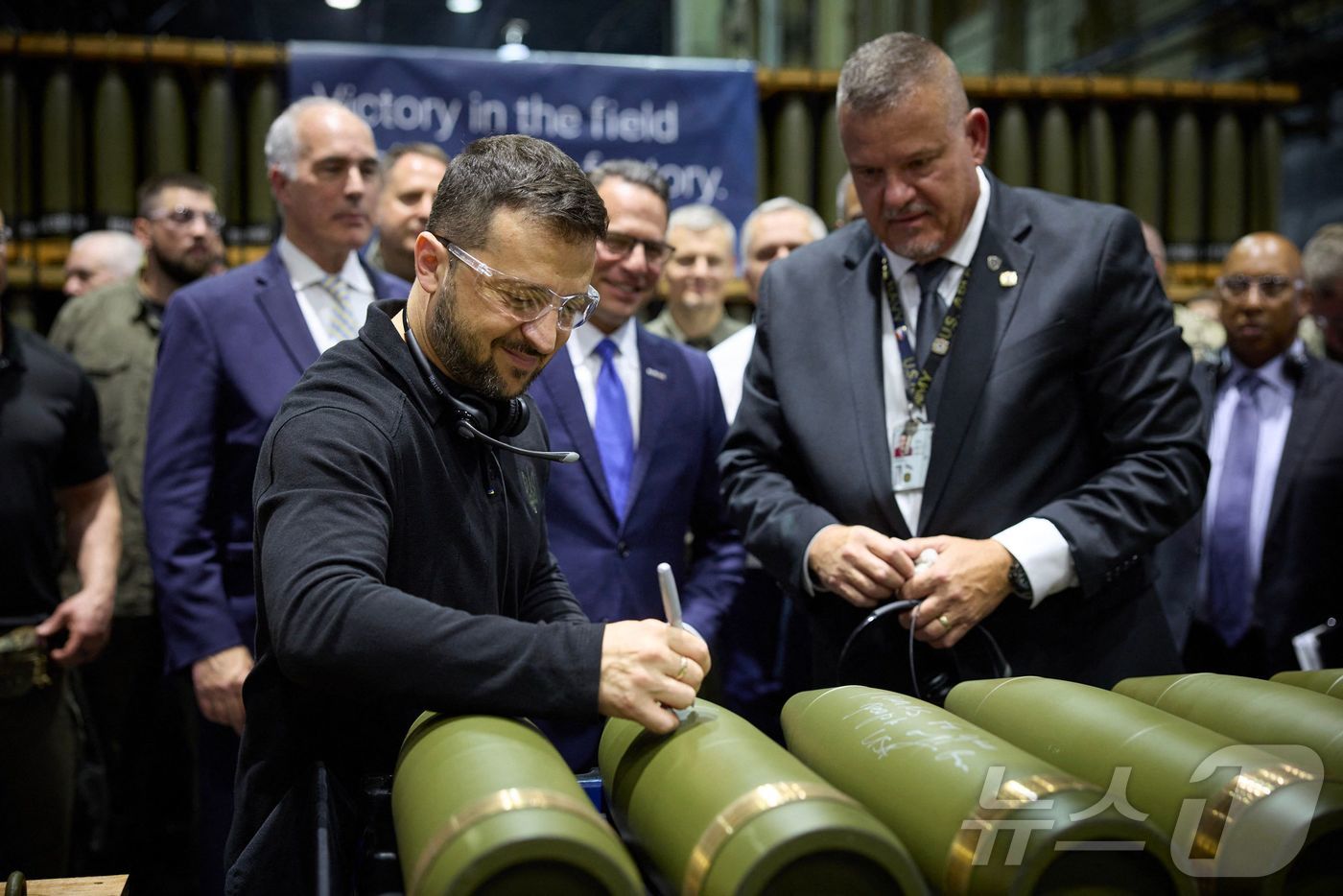 볼로디미르 젤렌스키 우크라이나 대통령이 지난해 9월 미국 방문 중 펜실베이니아주 스크랜턴 육군 탄약 공장을 방문해 포탄에 서명을 하고 있다. 2024.09.24 ⓒ AFP=뉴스1 ⓒ News1 우동명 기자 |