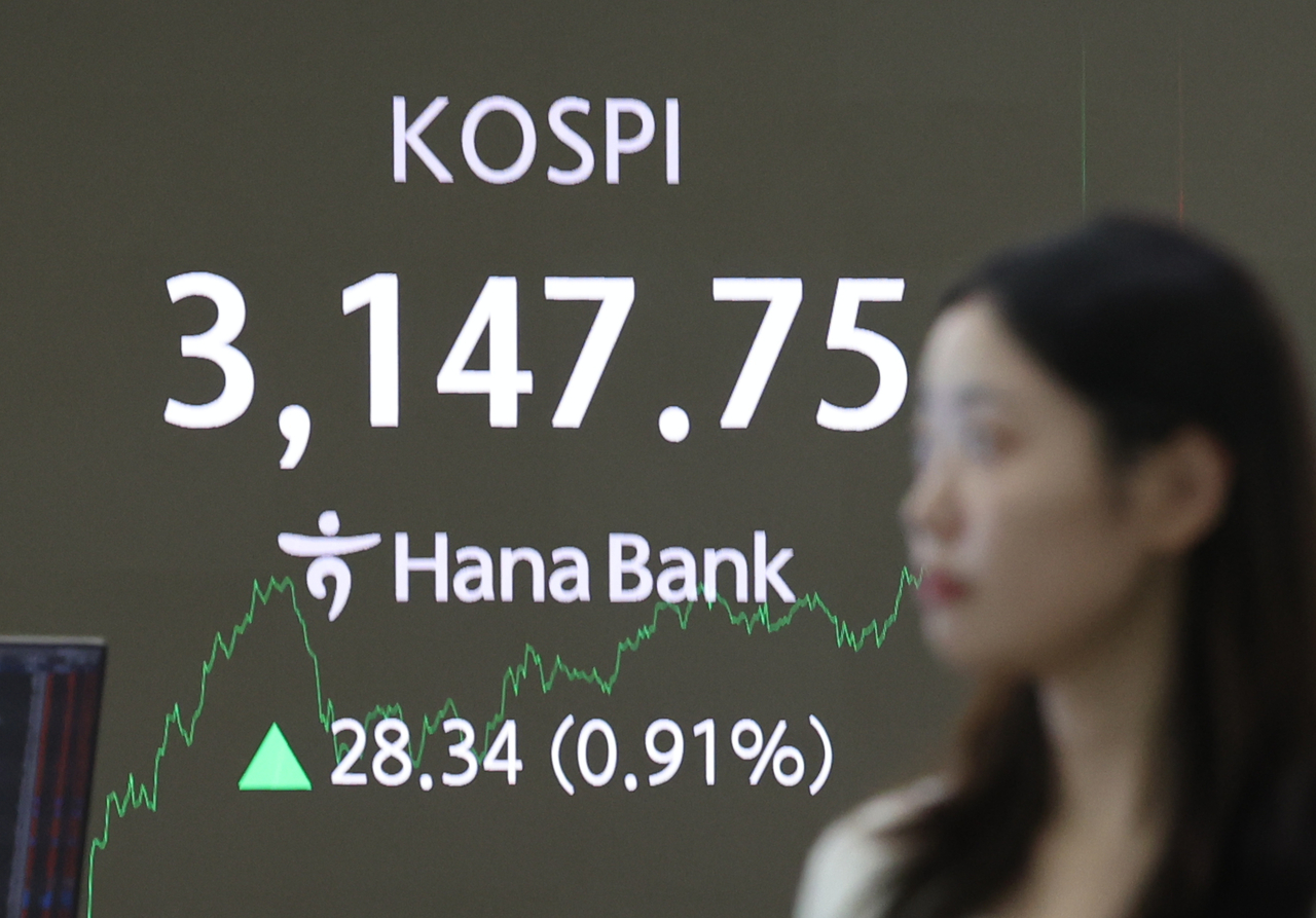 4일 서울 중구 하나은행 딜링룸 현황판에 코스피 종가가 표시돼있다. 이날 코스피는 전장보다 28.34포인트(0.91%) 오른 3147.75, 코스닥지수는 전장보다 11.27포인트(1.46%) 오른 784.06에 장을 마쳤다. [연합] |