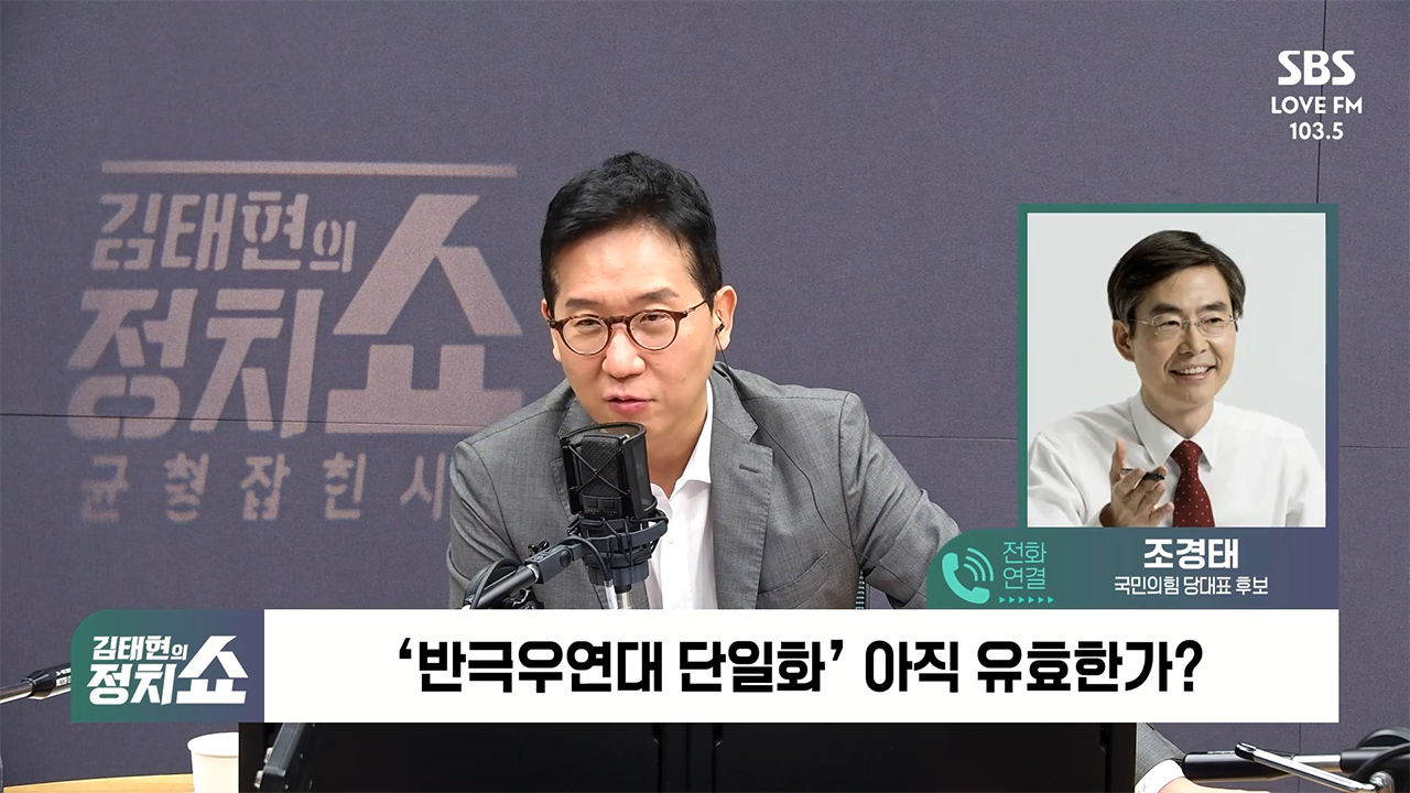 ▶조경태 : 아직까지는 반극우연대 단일화에 대해서 응답은 없으신데요. 항상 문은 열려 있다, 지금도 열려 있다고 보시면 되고요. 언제든지 단일화 방식에 대해서는 어떤 방식이든 저는 수용할 그런 자세가 돼 있거든요. 그래서 우리가 하나의 목소리로 일치단결할 때 혁신적인 그런 후보들이 당권을 잡아야만 당에 그나마 희망이 있다 이렇게 보는 거지요.