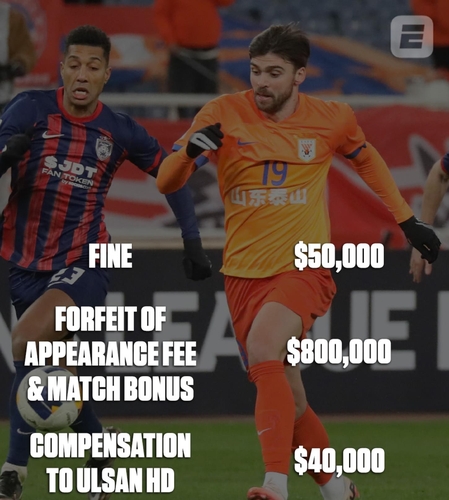 더불어 산둥은 AFC가 지급한 참가비와 매치 보너스 80만달러(11억원)를 반환하고 경기를 치르지 못한 울산에 보상금 4만달러(5천535만원)도 배상하게 됐다.