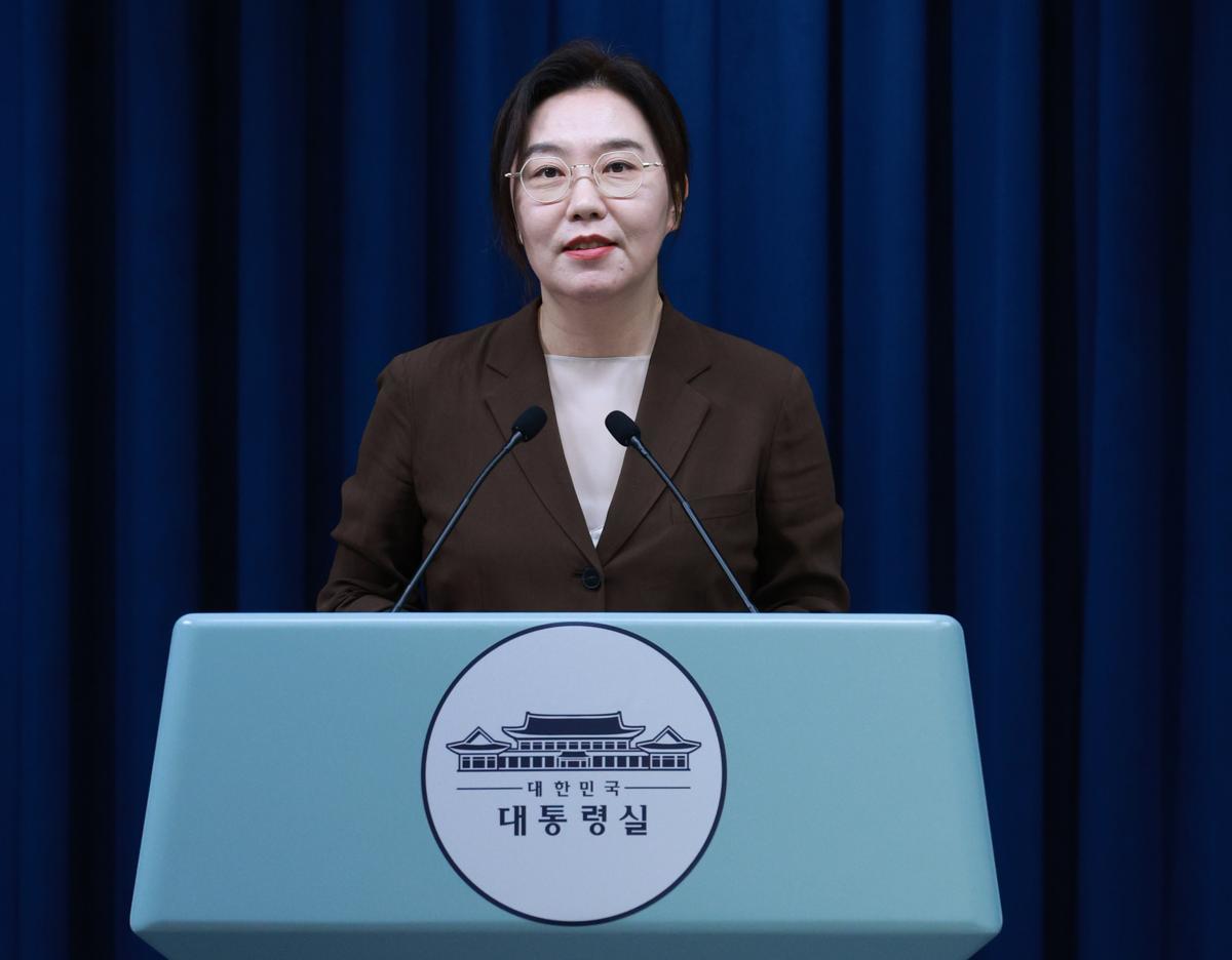 강유정 대변인이 5일 서울 용산 대통령실 청사에서 국민임명식 초청장 전달 관련 브리핑을 하며 출입기자 질문에 답하고 있다. 2025.08.05. 뉴시스 |