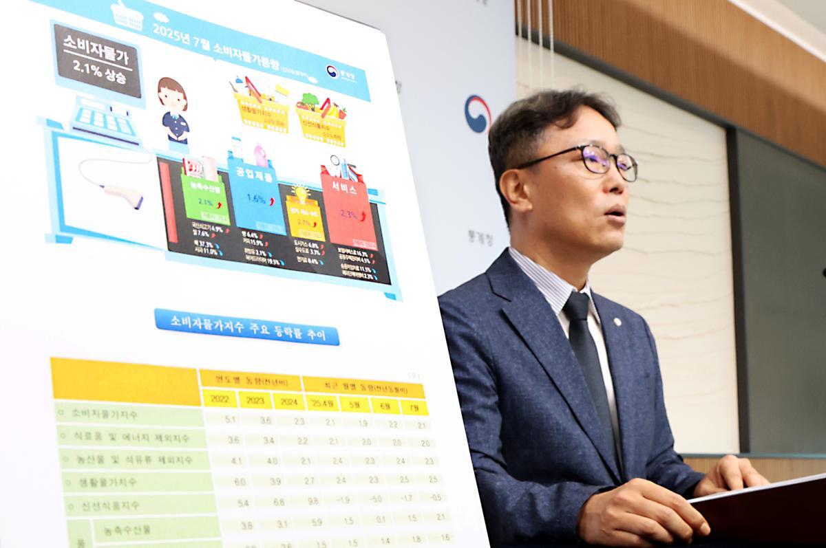 박병선 통게청 물가동향과장이 5일 세종시 정부세종청사에서 2025년 7월 소비자물가동향을 발표하고 있다. 7월 소비자물가지수는 116.52로 전월대비 0.2% 상승하였고, 전년동월대비로는 1.1% 상승했다. 2025.8.5. 뉴스1 |