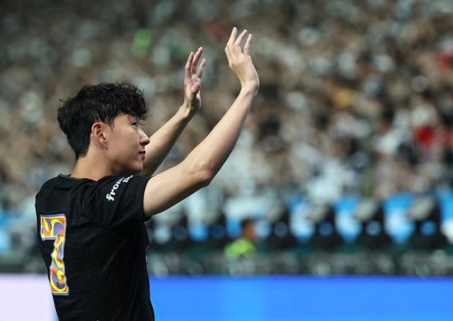 올여름 팀을 떠나기로 한 토트넘 손흥민이 3일 서울월드컵경기장에서 열린 2025 쿠팡플레이 시리즈 뉴캐슬과의 친선경기가 끝난 뒤 손을 흔들고 있다. 연합뉴스 |