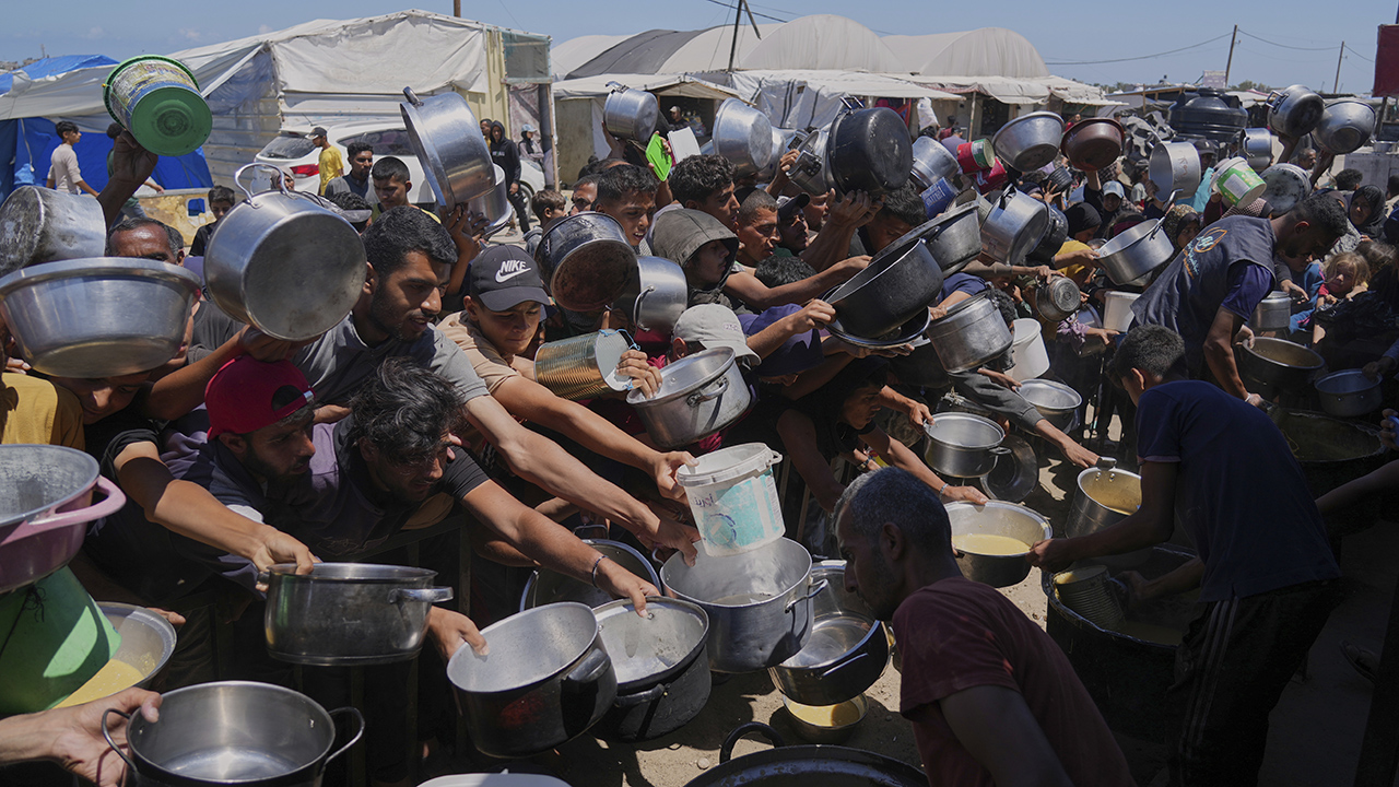▲ 가자지구 남부 칸 유니스의 한 커뮤니티 주방에서 팔레스타인 사람들이 기부된 음식을 받기 위해 고군분투하고 있다.