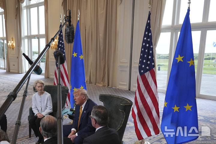 [턴베리=AP/뉴시스] 도널드 트럼프 미국 대통령이 27일(현지 시간) 스코틀랜드 턴베리의 트럼프 턴베리 골프장에서 우르줄라 폰데어라이엔 유럽연합(EU) 집행위원장과의 회담에 대해 발언하고 있다. 미국과 EU가 '상호관세 15%'를 골자로 한 무역 합의를 타결했다. 2025.07.28. |