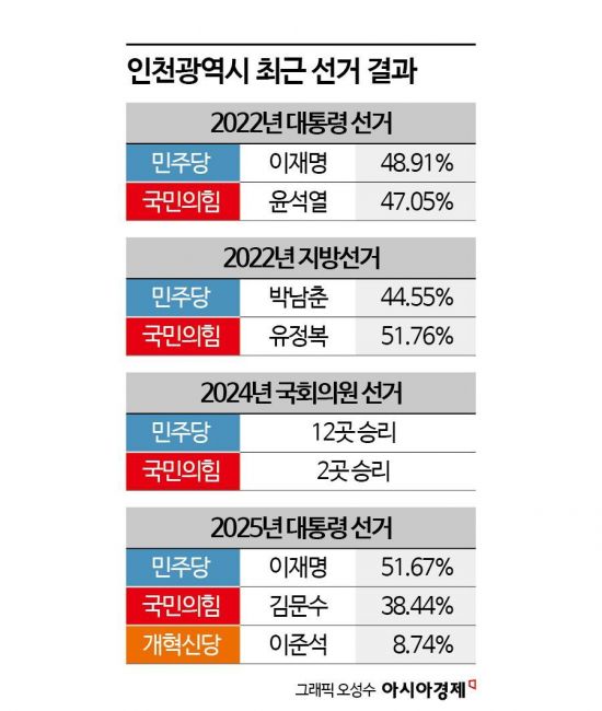 최근 선거 결과로만 보면 인천광역시는 민주당 우세 지역이다. 지난 2024년 총선에서 지역구 14곳 중 12곳을 민주당이 차지했다. 이번 대통령 선거에서도 이재명 대통령은 51.67%를 득표해 38.44% 득표에 그친 김문수 후보를 13%P 이상 앞섰다. 역대 대선 인천 지역에서 민주당 후보가 50% 득표를 넘긴 것은 이번이 처음이다. 2022년 대선 때(이재명 vs 윤석열) 격차(1.9%P)보다 훨씬 더 벌어졌다. 2022년 지방선거에서 유정복 국민의힘 후보가 박남춘 민주당 후보를 7%P 이상 앞섰다. 그러나 당시는 윤석열 정부가 등장한 지 3개월도 안 됐을 때였다. 지금은 반대다. 기본 지형도 불리한데다가 민주당이 집권한 지 1년 만에 지방선거를 치르게 되니 국민의힘으로서는 긴장할 수밖에 없는 상황이다.