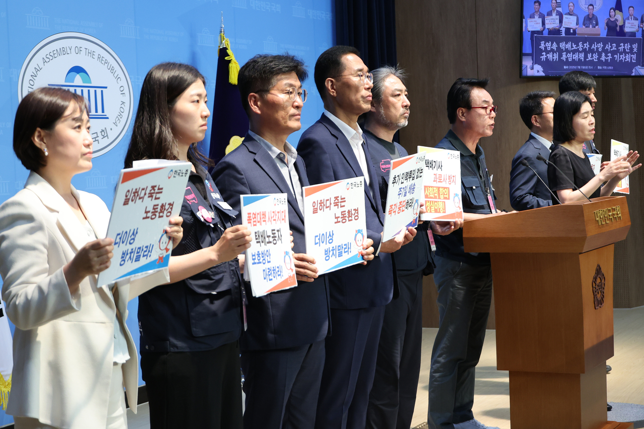 11일 서울 여의도 국회 소통관에서 더불어민주당 노동존중실천단·을지로위원회 소속 의원들과 한국노총연대노조 택배산업본부 조합원 등이 폭염 속 택배노동자 사망 사고와 관련해 대책 마련을 촉구하는 기자회견을 하고 있다. [연합] |