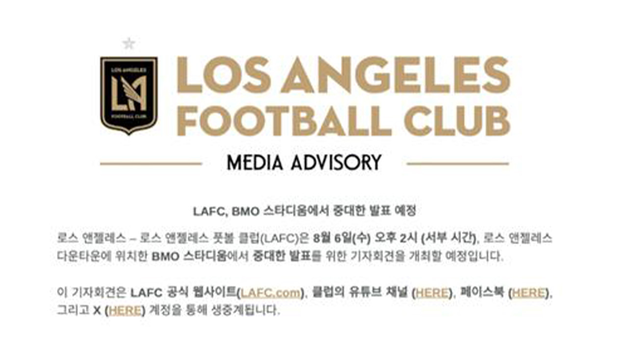 LAFC는 보도자료를 내고 "현지시간 6일 오후 2시 LA 다운타운에 위치한 BMO 스타디움에서 중대한 발표를 위한 기자회견을 개최할 예정"이라고 밝혔습니다.