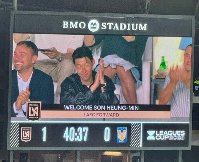 손흥민은 6일(한국시간) 미국 캘리포니아주 로스앤젤레스의 BMO 스타디움에서 열린 LAFC와 멕시코 클럽 티그레스 UANL의 북중미 리그컵 경기 도중 전광판을 통해 홈팬들에게 먼저 인사했다. 손흥민은 이날 로스앤젤레스에 도착하자마자 곧장 경기장으로 이동해 베넷 로젠탈 LAFC 공동 구단주와 함께 경기를 관전했다.