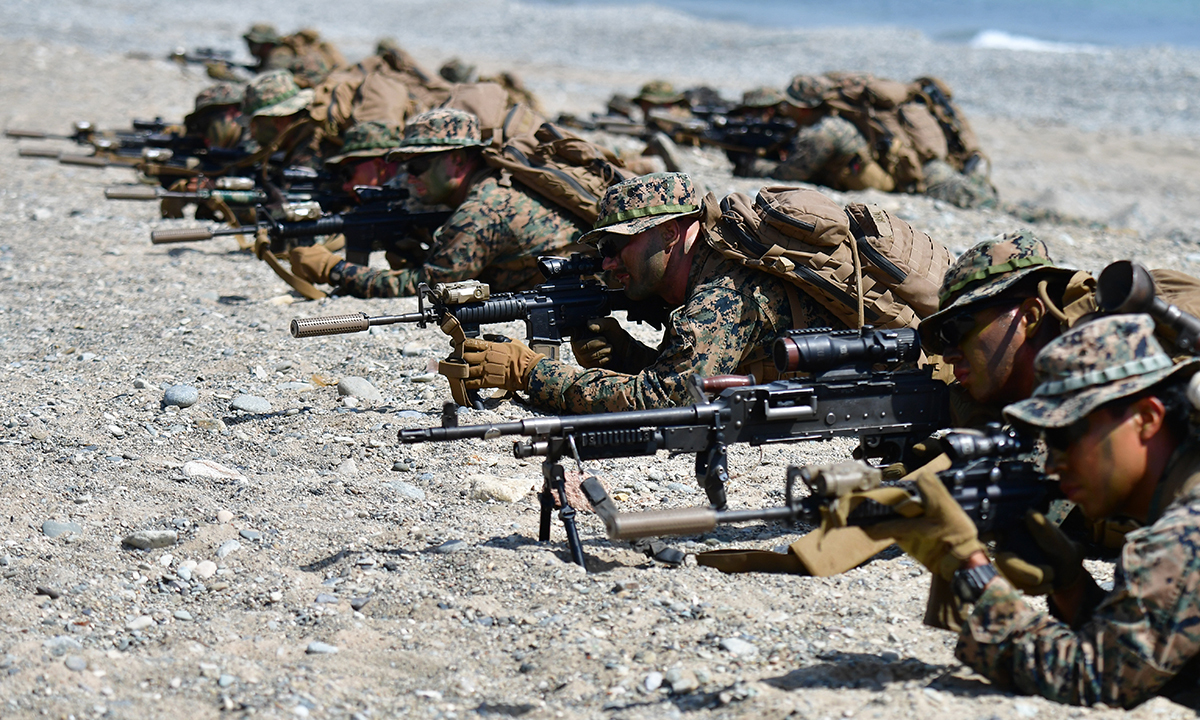6일 경북 포항시 북구 송라면 해안에서 실시된 한·미 해병대 상륙훈련에서 미 해병대원들이 가상의 적과 교전을 준비하고 있다. 포항=뉴스1 |