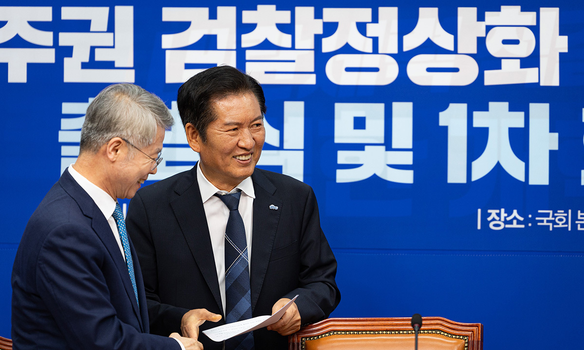 특위 위원장을 맡은 민형배 의원은 “수사와 기소를 완전히 분리해 검찰청에 집중됐던 권한을 공소청과 중대범죄수사청으로 나누고, 국민주권을 실현하고 민생을 뒷받침하겠다”고 밝혔다. 민 의원은 “8월 말까지 구조 개혁을 담은 검찰 정상화 법안을 완성하겠다”며 “정 대표 말대로 추석 밥상에 검찰청 폐지를 올려드리겠다”고 약속했다. 그는 2022년 이른바 ‘검수완박’(검찰 수사권 완전 박탈) 통과를 위해 탈당까지 감행한 이력이 있는 강경 검찰개혁론자로 꼽힌다. 민 의원은 회의를 마친 뒤 기자들과 만나 “오늘 결정한 대원칙은 수사와 기소의 완전 분리, (검찰의) 보완수사권도 남겨놓지 않는다는 것”이라며 “내일(7일)부터 당·정·대 협의 기구를 가동한다”고 말했다.