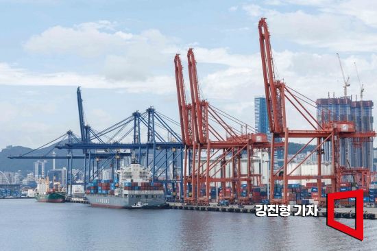 부산항에 정박 중인 컨테이너선에 화물이 쌓여 있다. |