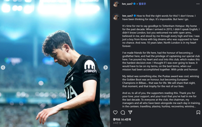 마지막으로 그는 “지금 이 글을 읽고 있는 모든 팬 여러분께, 지난 10년 동안 저에게 보내주신 사랑과 응원, 믿음에 진심으로 감사드린다. 클럽의 모든 분들, 회장님, 감독님들, 그리고 매일 함께 훈련하고, 구내식당에서 식사하고, 이동하고, 경기를 뛰고, 함께 아파하고, 회복하고, 승리해왔던 모든 분들께 마음 깊은 곳에서부터 진심을 담아 감사드린다. 여러분이 나를 자랑스럽게 여겨주셨길 바란다. 쏘니가♥”라는 글로 토트넘과 작별했다.