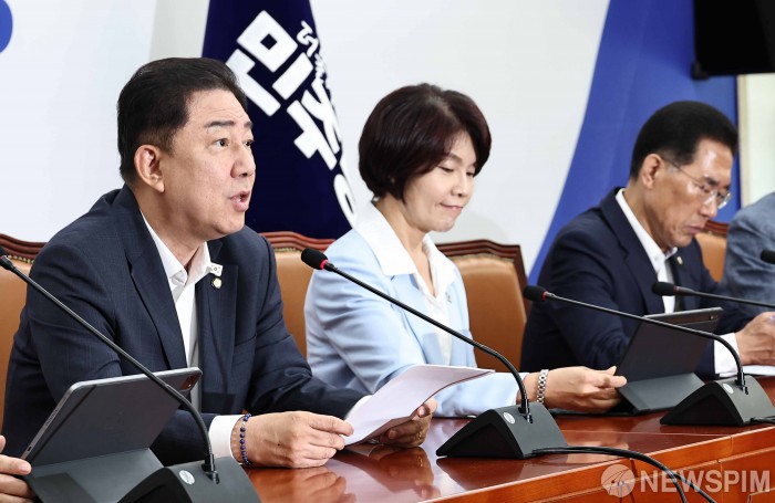 [서울=뉴스핌] 윤창빈 기자 = 김병기 더불어민주당 대표 원내대표가 7일 오전 서울 여의도 국회에서 열린 정잭조정회의에서 모두발언을 하고 있다. 2025.08.07 pangbin@newspim.com