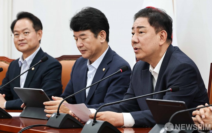 [서울=뉴스핌] 윤창빈 기자 = 김병기 더불어민주당 대표 원내대표가 7일 오전 서울 여의도 국회에서 열린 정잭조정회의에서 모두발언을 하고 있다. 2025.08.07 pangbin@newspim.com