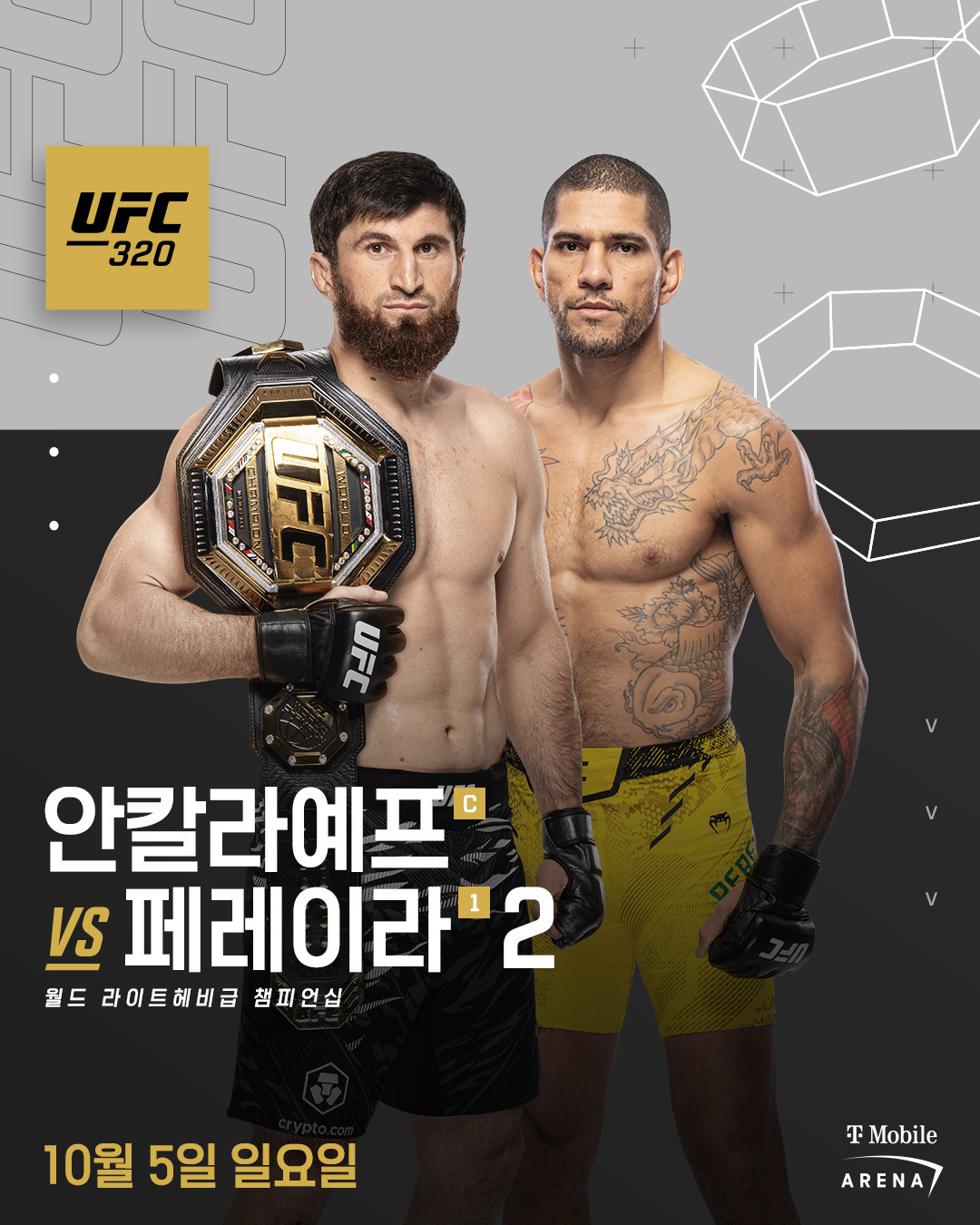 ‘UFC 320: 안칼라예프 vs 페레이라 2’는 오는 10월5일(한국 시간) 미국 네바다주 라스베이거스 티모바일 아레나에서 개최된다. 더불어 이날 코메인 이벤트에서는 UFC 밴텀급(61.2㎏) 챔피언 메랍 드발리쉬빌리(조지아)가 랭킹 4위 도전자 코리 샌드헤이건(미국)과 격돌한다.
