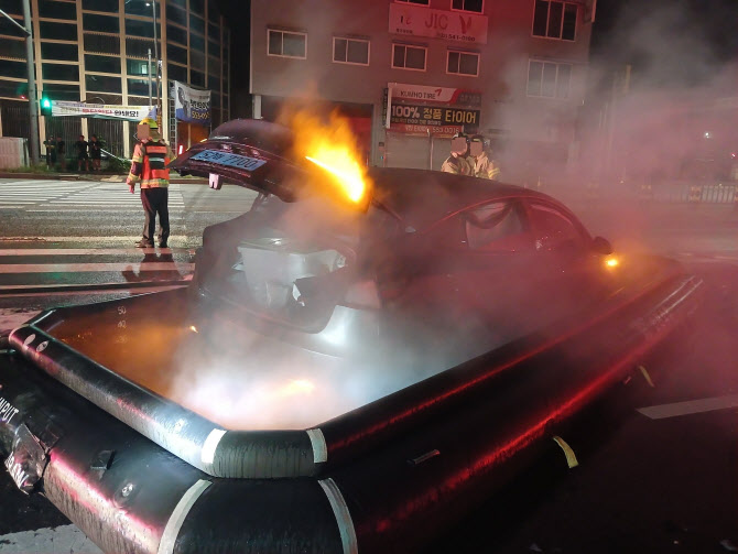 7일 0시34분께 인천 계양구 효성동 한 도로에서 테슬라 모델3 승용차에서 불이 나 출동한 소방대원들이 이동식 수조를 이용해 진화하고 있다. (사진 = 인천소방본부 제공) |