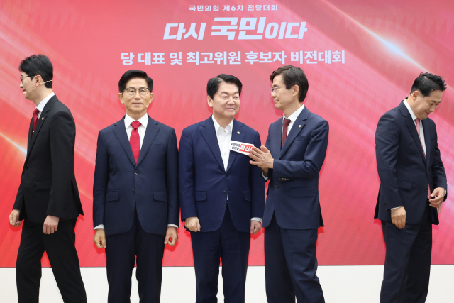 ▲국민의힘 주진우(왼쪽부터)·김문수·안철수·조경태·장동혁 당대표 후보가 3일 서울 여의도 국민의힘 당사에서 열린 제6차 전당대회 후보자 비전대회에서 기념촬영 후 무대에서 내려가고 있다. ⓒ연합뉴스 |