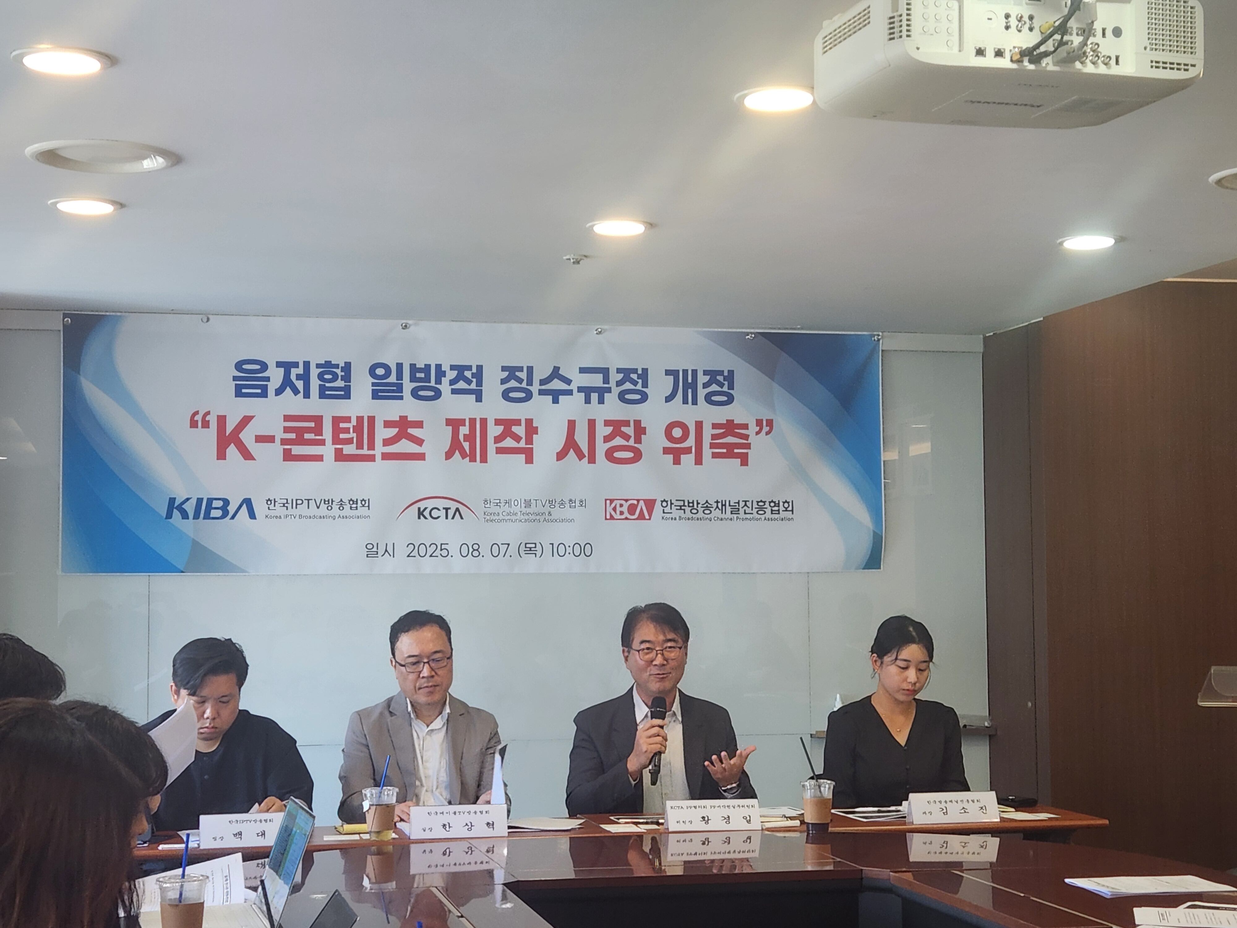 한국케이블TV방송협회가 7일 개최한 ‘음저협의 음악 저작권료 징수규정 개정 추진’ 기자간담회에 참석한 한국IPTV방송협회, 한국방송채널진흥협회, SO협의회, PP협의회 등 유료방송업계 관계자들은 이같이 한 목소리를 냈다.