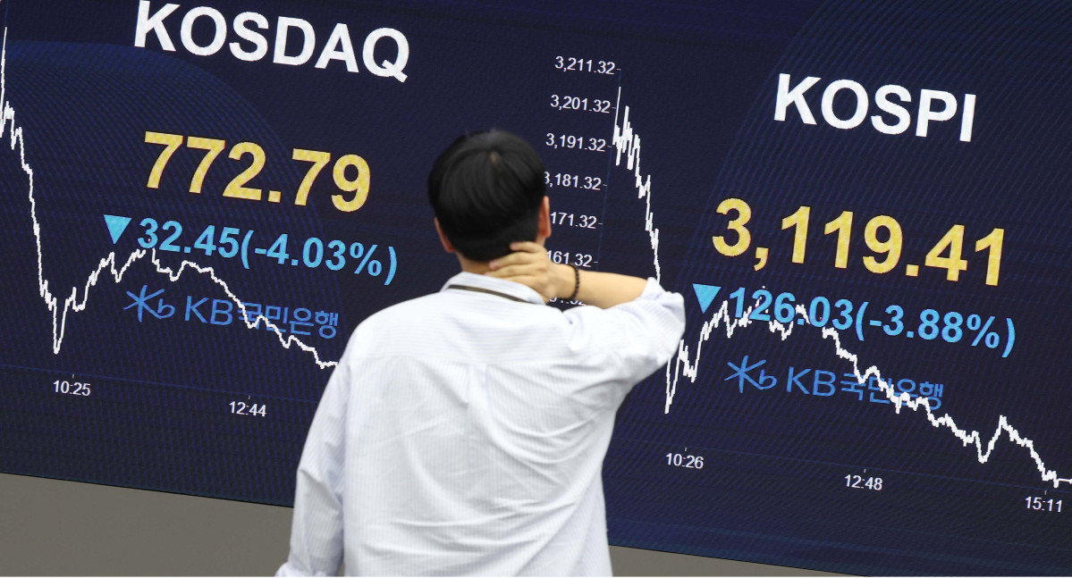 코스피와 코스닥이 세제개편안에 대한 기대감 후퇴로 4% 안팎의 큰 낙폭을 기록한 가운데 1일 서울 여의도 KB국민은행 스마트딜링룸 모니터에 코스피 종가가 표시되고 있다. 이날 코스피는 전일 대비 126.03p(3.88%) 하락한 3119.41에 마감했다. 코스닥은 전일 대비 32.45p(4.03%) 내린 772.79를 기록했다. 원·달러 환율은 달러 강세와 외국인 주식 매도에 두달 여 만에 1400원대로 급등, 서울 외환시장에서 미국 달러화 대비 원화 환율의 주간거래 종가는 전날보다 14.4원 오른 1401.4원으로 집계됐다. 사진=신태현 기자 holjjak@ |