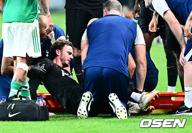 [OSEN=서울월드컵경기장, 이대선 기자] 3일 오후 서울월드컵경기장에서 쿠팡플레이 시리즈 20252경기, 토트넘 홋스퍼 FC와 뉴캐슬 유나이티드 FC의 프리시즌 친선경기가 열렸다.토트넘 손흥민의 고별전이자 양민혁과 뉴캐슬 박승수의 맞대결로 주목받는 이번 경기는 단순한 프리시즌 친선경기가 아닌, 전설의 마지막, 신예의 등장 교차점이라는 특별한 의미가 더해진다.후반 토트넘 홋스퍼 제임스 매디슨이 부상으로 실려 나가고 있다. 2025.08.03 /sunday@osen.co.kr |