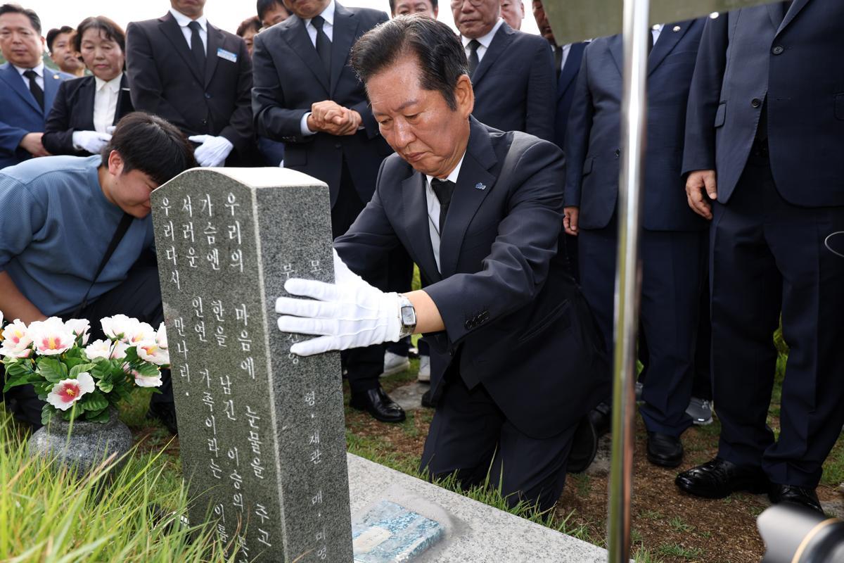 5·18 민주묘지 참배 더불어민주당 정청래 대표가 8일 오전 광주 북구 국립 5·18민주묘지를 방문해 문재학 열사의 묘비를 어루만지고 있다. 문 열사는 한강 작가의 소설 ‘소년이 온다’의 실제 주인공이다. 광주=뉴스1 |