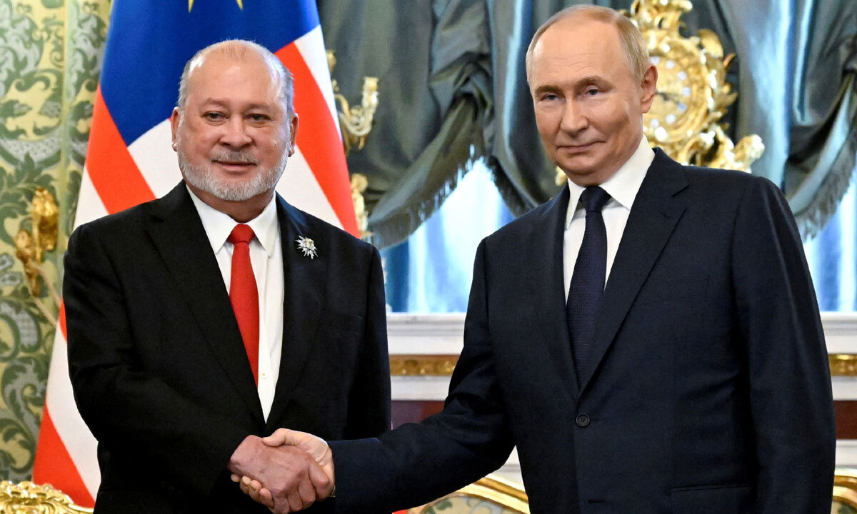 러시아를 국빈 방문 중인 이브라힘 이스칸다르 말레이시아 국왕(왼쪽)이 6일(현지시간) 크레믈궁에서 블라디미르 푸틴 러시아 대통령과의 정상회담에 앞서 악수를 나누고 있다. 로이터연합뉴스 |