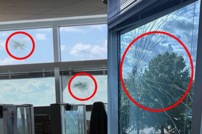 8일(현지시간) 질병통제예방센터(CDC) 본부 인근에서 발생한 총격으로 건물 유리창이 총탄에 맞아 파손됐다. 엑스(X) 캡처 |