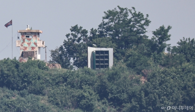지난 6월12일 경기 파주시 접경지역에서 바라 본 북측 초소와 대남 확성기. / 사진=뉴스1 |