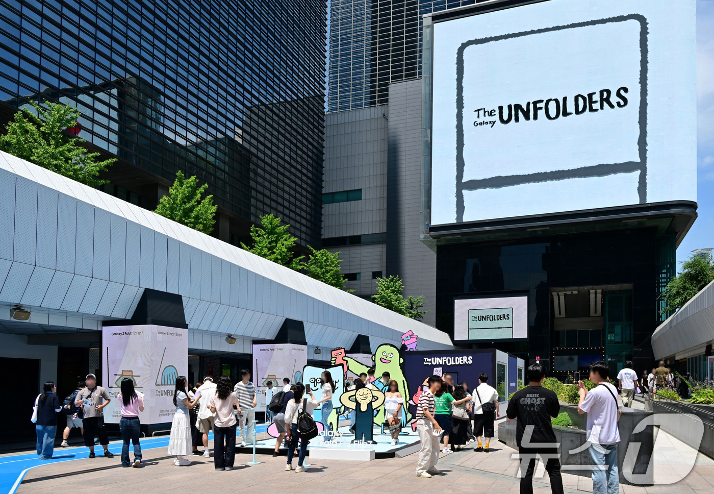 (서울=뉴스1) 박지혜 기자 = 삼성전자가 아티스트 '장 줄리앙(Jean Jullien)'과 협업해 지난 25일부터 서울 코엑스 전역에서 운영 중인 갤럭시 폴더블폰 체험존은 지난 8일까지 집계된 방문객 수가 10만명을 돌파하며 인기를 끌고 있다. 사진은 서울 코엑스 ‘The Galaxy UNFOLDERS’ 체험존을 찾은 방문객들이 ‘갤럭시 Z 폴드7'으로 아티스트 '장 줄리앙(Jean Jullien)'의 캐릭터와 함께 인증샷을 촬영하는 모습. (삼성전자 제공. 재판매 및 DB 금지) 2025.8.10/뉴스1