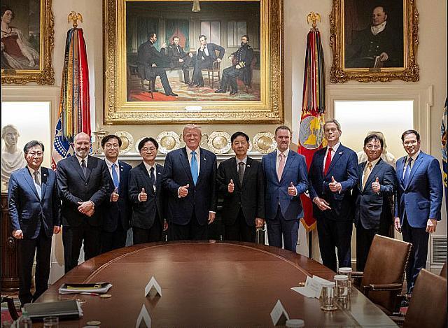 [서울=뉴스핌] 최문선 기자 = 도널드 트럼프 (왼쪽 다섯 번째) 미국 대통령이 지난달 30일 워싱턴DC 백악관에서 구윤철(여섯 번째) 부총리 겸 기획재정부 장관 등 한국 정부 협상단과 함께 관세 협상 타결을 기념하는 사진 촬영을 하고 있다. [사진=백악관 X 캡처] 2025.08.10 moonddo00@newspim.com |