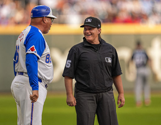 젠 파월이 9일(현지시간) 미국 조지아주 애틀랜타의 트루이스트파크에서 벌어진 마이애미 말린스와 애틀랜타 브레이브스의 더블헤더 1차전에 1루심으로 출장, 애틀랜타 3루 코치 프레디 곤잘레스와 이야기를 나누고 있다. 로이터=연합뉴스 |
