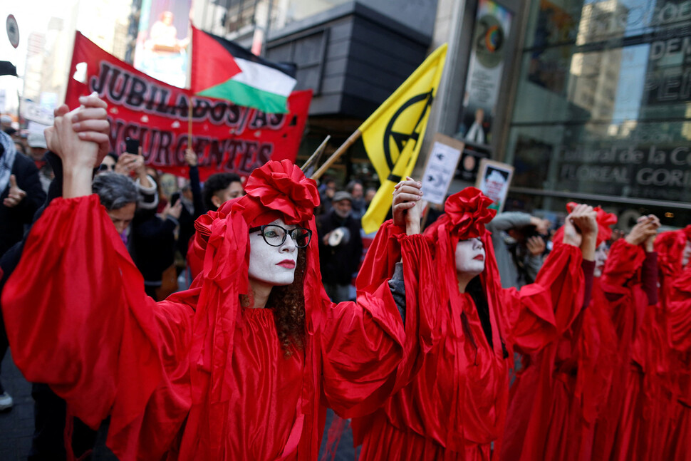 9일(현지시각) 아르헨티나 부에노스아이레스에서 열린 팔레스타인 연대 시위에서 예술가들이 붉은 옷을 입고 행진하고 있다. 로이터 연합뉴스 |