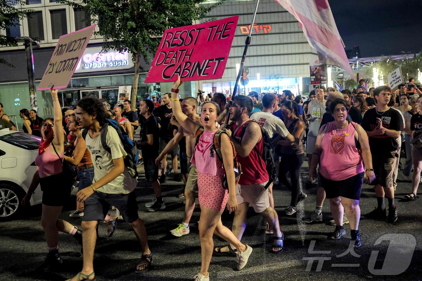 (서울=뉴스1) 이창규 기자 = 이스라엘에서 9일(현지시간) 가자지구를 점령하는 계획을 승인한 이스라엘 안보 내각 결정에 반발해 전쟁 종식을 촉구하는 대규모 시위가 벌어졌다.