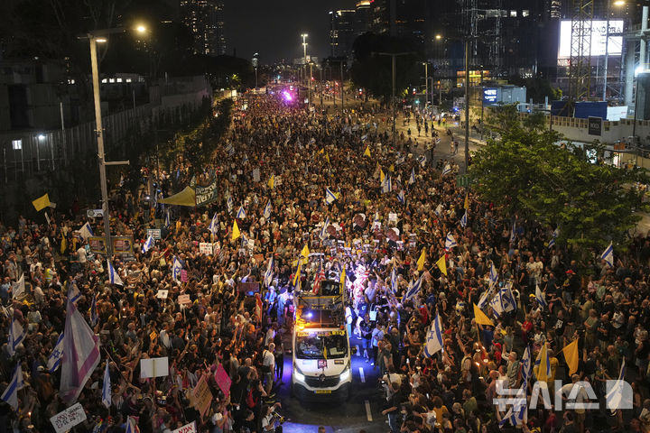 이런 네타냐후의 전쟁 확대안에 반대하는 10만 명이 넘는 이스라엘인이 최대도시 텔아브비에 모였다고 시위 조직체는 말했다.