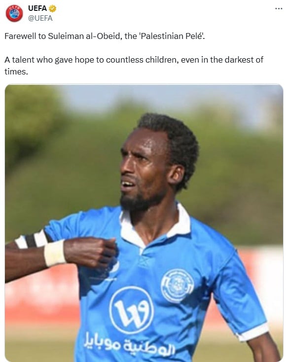 UEFA는 추모글에서 “어두운 시기에도 수많은 아이들에게 희망을 준 재능 있는 선수 ‘팔레스타인 펠레’ 술레이만 알 오베이드에게 작별 인사를 전한다”면서도 이스라엘을 의식한 듯 그가 사망한 원인이나 장소 등은 언급하지 않았는데 이를 꼬집은 것이다.