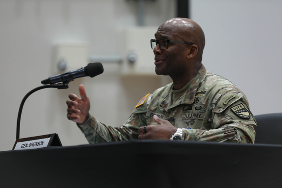 제이비어 브런슨 주한미군 사령관이 지난 8일 경기도 평택시 캠프 험프리스에서 열린 기자간담회에서 질문에 답하고 있다. [사진 주한미군사령부] |