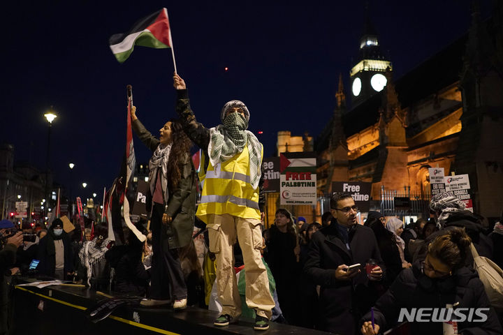 [런던=AP/뉴시스] 런던 시경이 주말인 8월 9일 런던 국회의사당 앞 시위에 참가한 '팔레스타인 액션' 회원 532명을 체포했다고 10일 발표했다. 사진은 2023년 11월 런던의 국회의사당 앞에서 팔레스타인 깃발을 흔들며 시위하고 있는 친 팔레스타인 단체들. 2025. 08.11. |