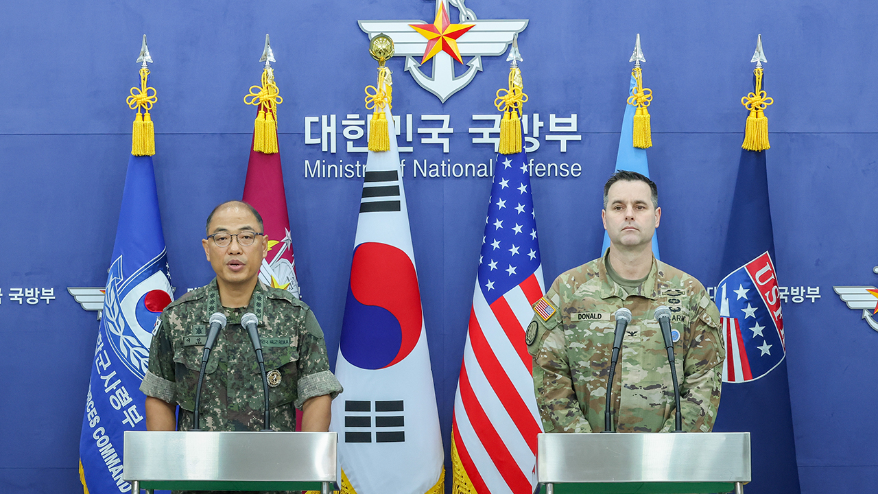 ▲ 이성준 합동참모본부 공보실장(왼쪽)과 라이언 도널드 유엔사·연합사·주한미군사 공보실장이 지난 7일 서울 용산구 국방부 브리핑룸에서 2025년 을지 자유의 방패(UFS) 연습 한미 공동브리핑을 하고 있다.